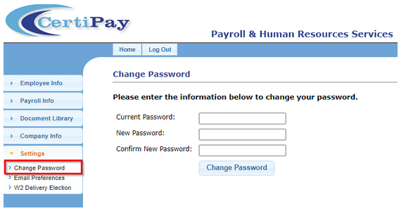 Click the Change Password link to allow employees to change the password used to log into the CertiPay Employee Self Service.