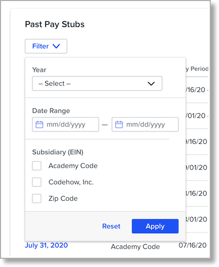 If you are paid via multiple subsidiaries (EINs), you can select the specific subsidiary you want to view paystubs for.