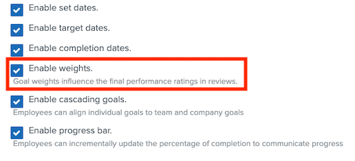 Using weights needs to be turned on in the Global Settings (found in Manage Reviews/ Performance > Goals > Global Settings)