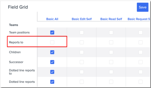 Scroll down to Reports To under the Teams section of the Field Grid.