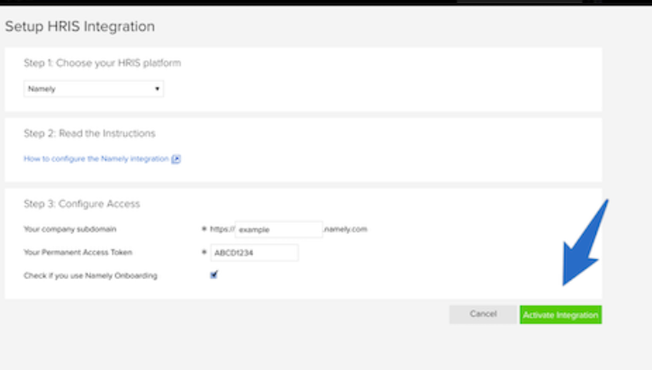 On the Setup HRIS integration page, choose Namely in step 1, then click I'm ready in step 2.