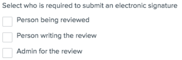 If enabled, review participants will be prompted to sign an eSiganture before they complete their portion of the review. This can be broken down by role as follows: